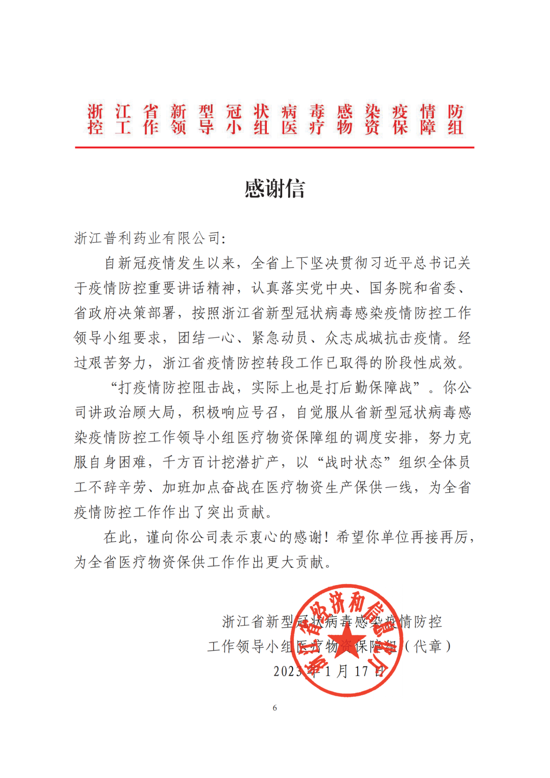 最终,这一努力也得到了浙江省新型冠状病毒感染疫情防控工作领导小组医疗物资保障组的认可! 未来,浙江普利药业将再接再厉,为全省医疗物资保供工作作出更大贡献。