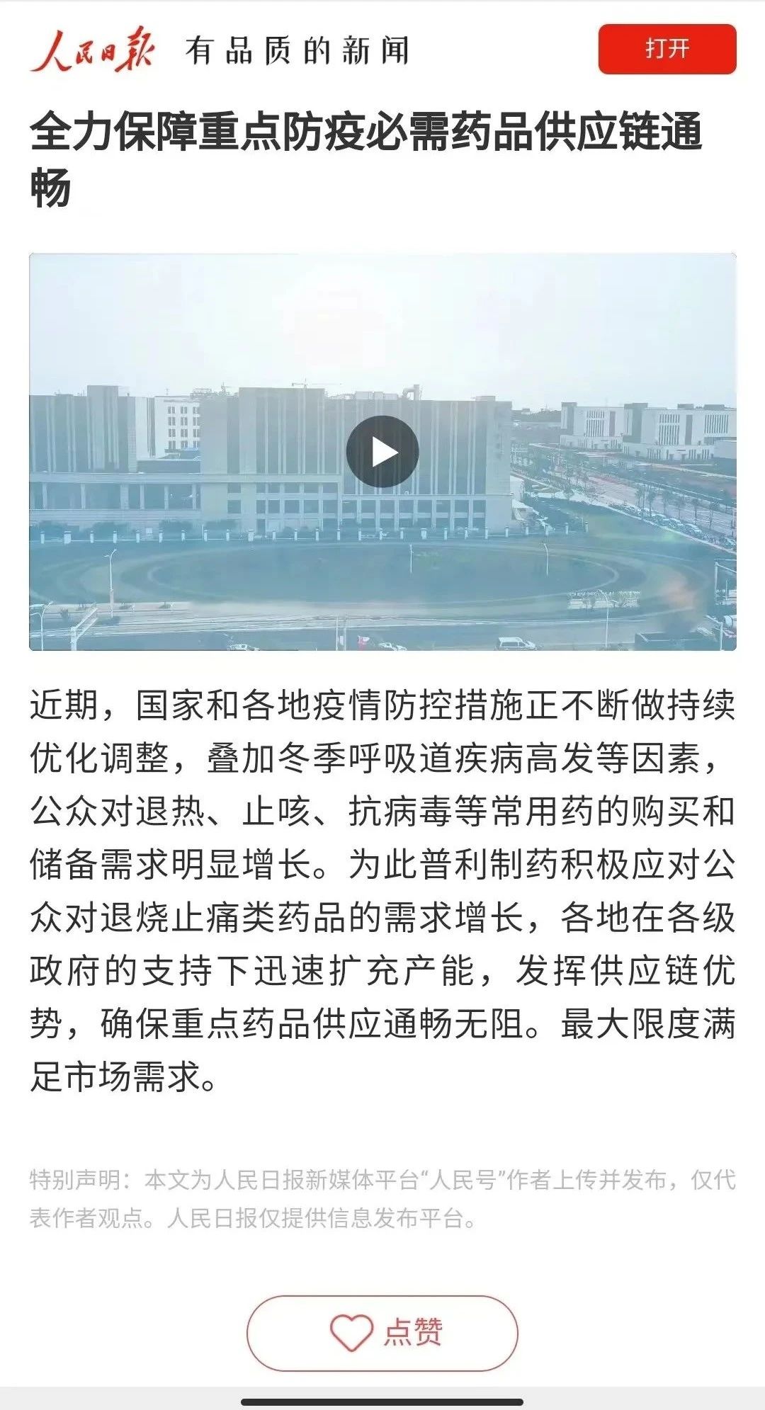 人民日报点赞:普利制药全力保障重点退烧药品供应链通畅!
