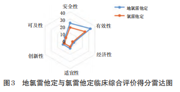 本研究结果显示,地氯雷他定治疗荨麻疹的临床综合评价总分为93.63分,氯雷他定为70.91分;结合雷达图结果可知,地氯雷他定在安全性、有效性、经济性、适宜性、创新性、可及性 6 个维度均较氯雷他定更具有优势。
