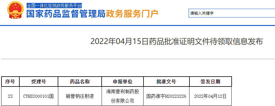 4月15日,国家药监局官网显示,普利制药的硝普钠注射液顺利获批,作为新分类注册品种,获批后视同通过一致性评价,是目前唯一过评的硝普钠注射剂,同时也是唯一一款水针剂型的硝普钠注射剂。